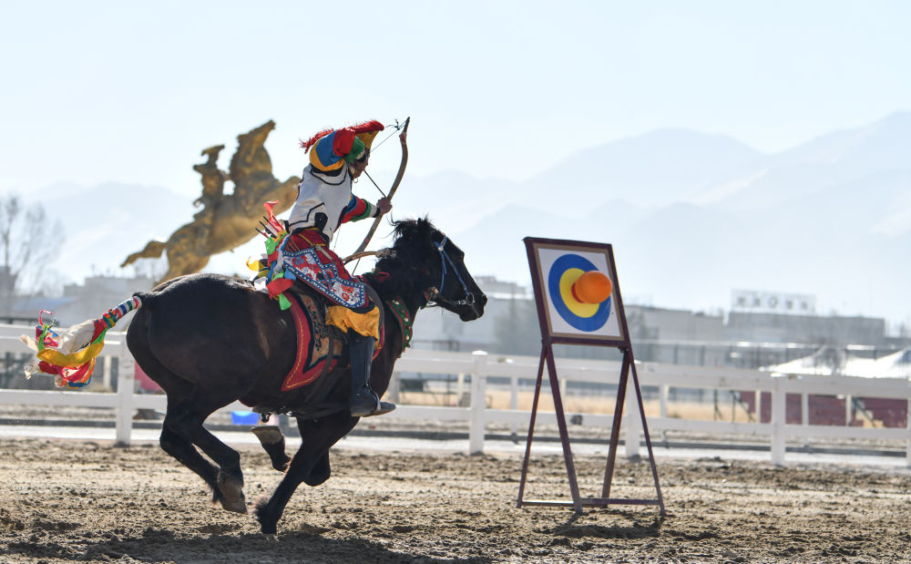 一名騎手在進行馬術射箭表演。新華社記者晉美多吉攝