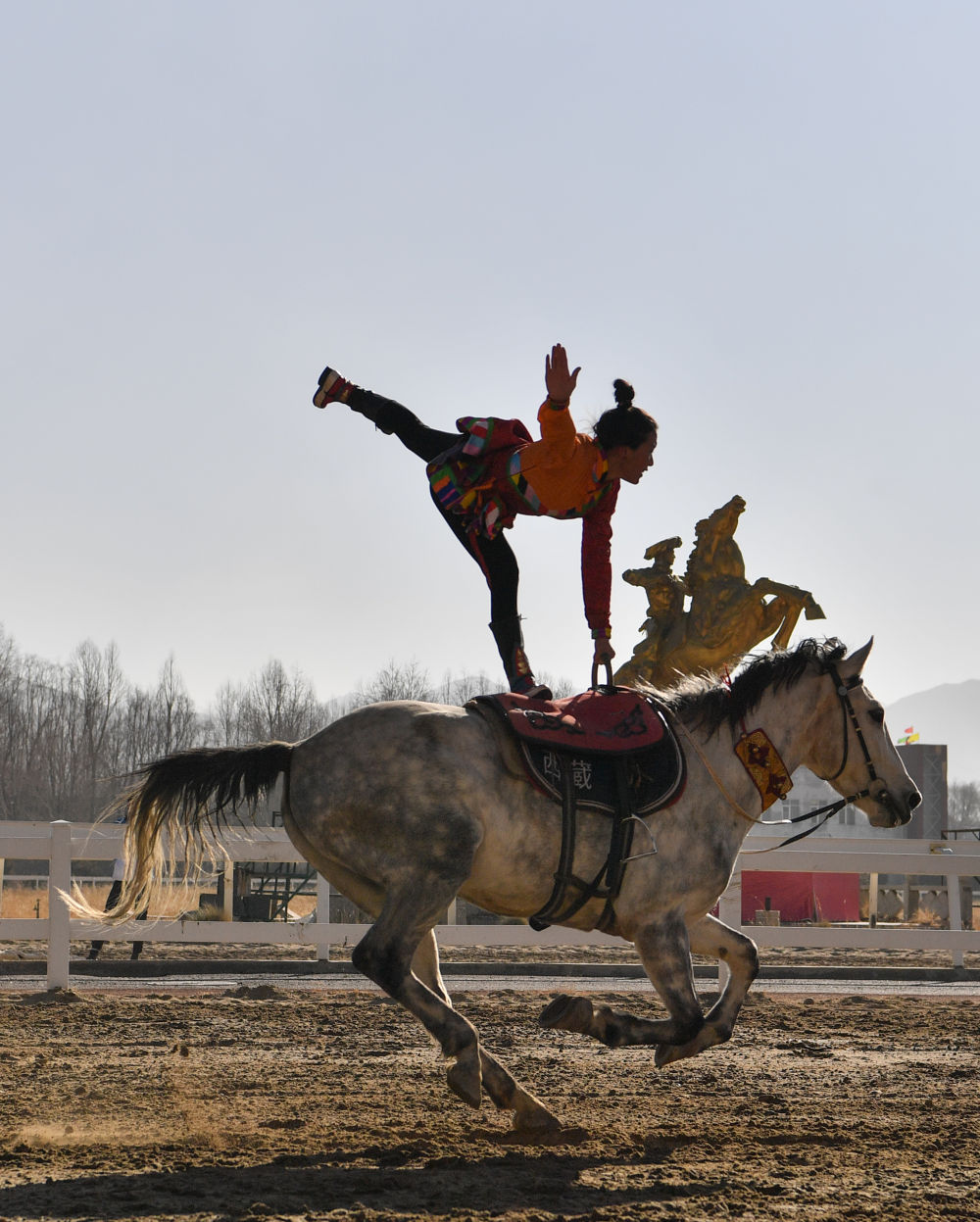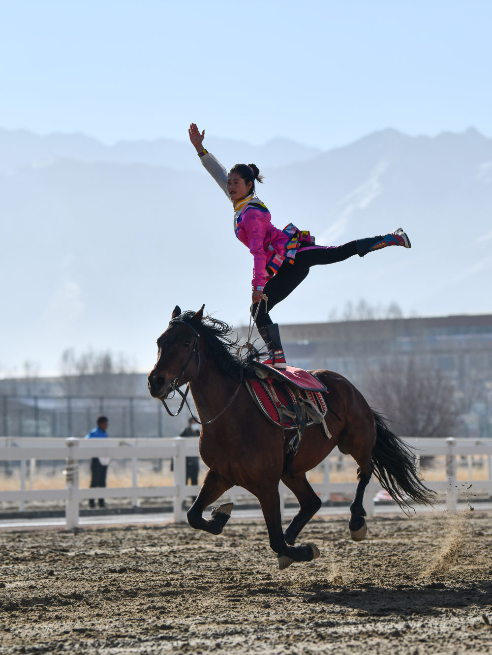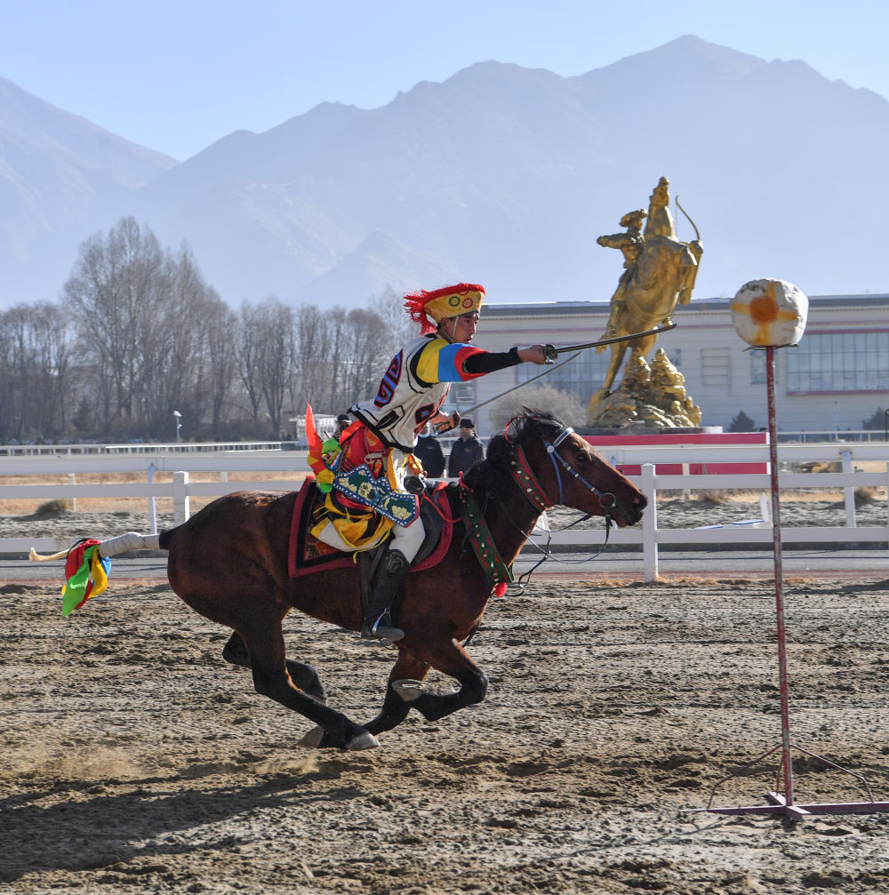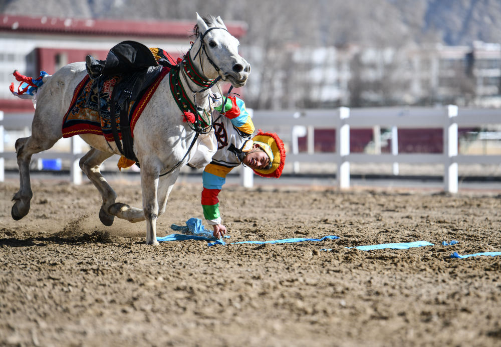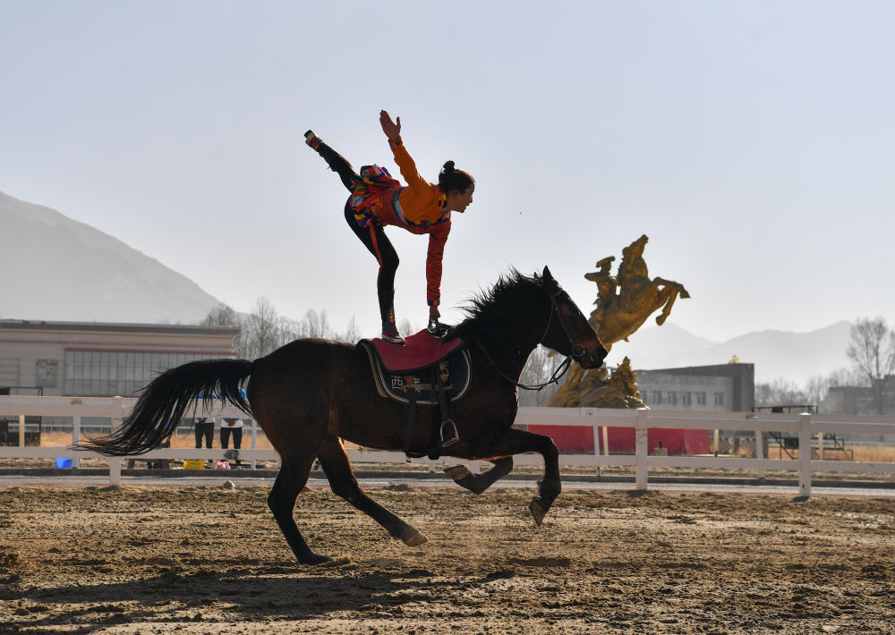2月14日,為慶祝藏歷新年,西藏自治區體育局組織自治區馬術隊在拉薩北郊賽馬場舉行馬術表演。因疫情防控需要,這次表演被搬到“線上”,通過網絡直播發布。