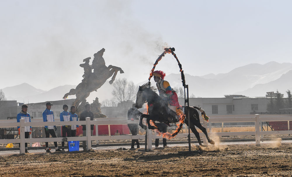 一名騎手在進行鉆火圈表演。新華社記者晉美多吉攝