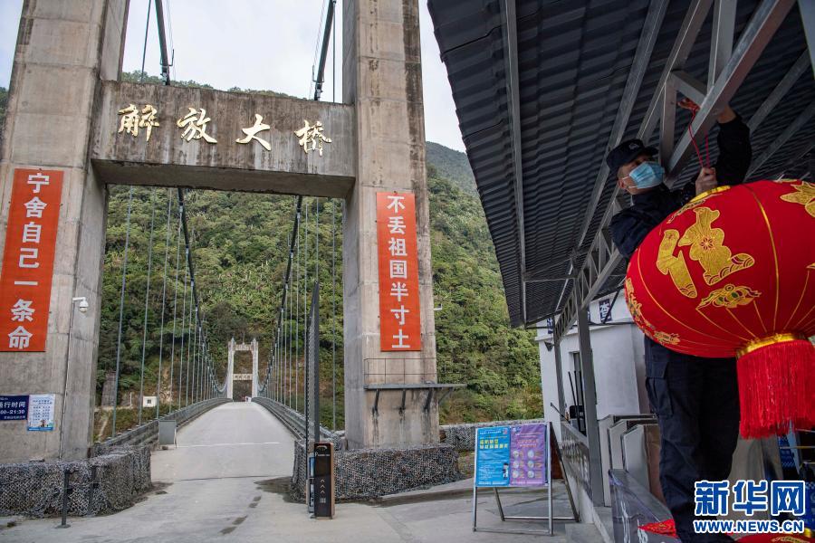 在解放大橋執勤點,西藏林芝邊境管理支隊墨脫大隊背崩邊境派出所的民警在懸掛紅燈籠(2月10日攝)。新華社記者 孫非 攝