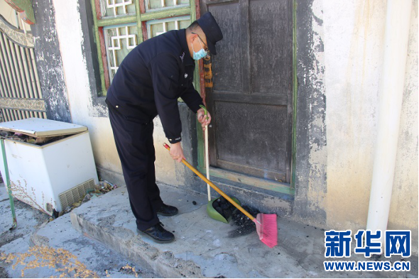 西藏出入境邊檢總站執(zhí)法調查支隊六隊民警清掃街道(3月4日攝)。新華網發(fā) 代旭攝