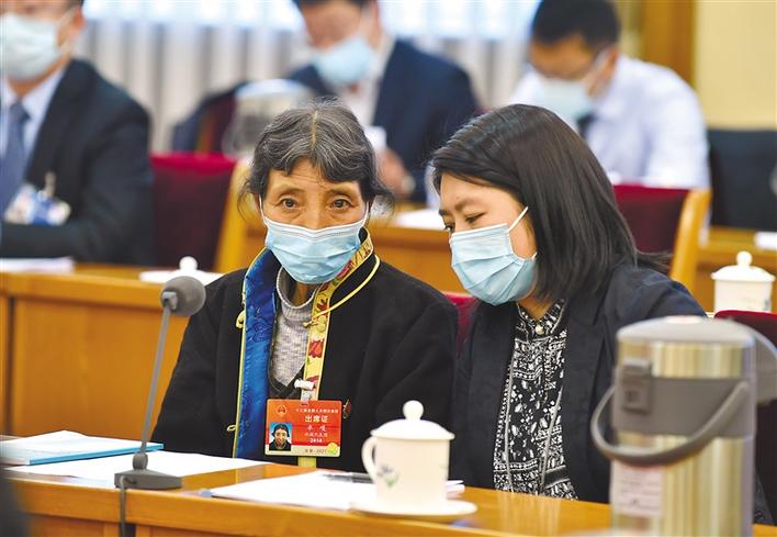 圖為為協助基層全國人大代表更全面地了解會議內容,十三屆全國人大四次會議西藏代表團專門配備了翻譯人員。圖為西藏全國人大代表卓嘎通過翻譯人員了解其他代表的發言內容。旦增西旦 攝