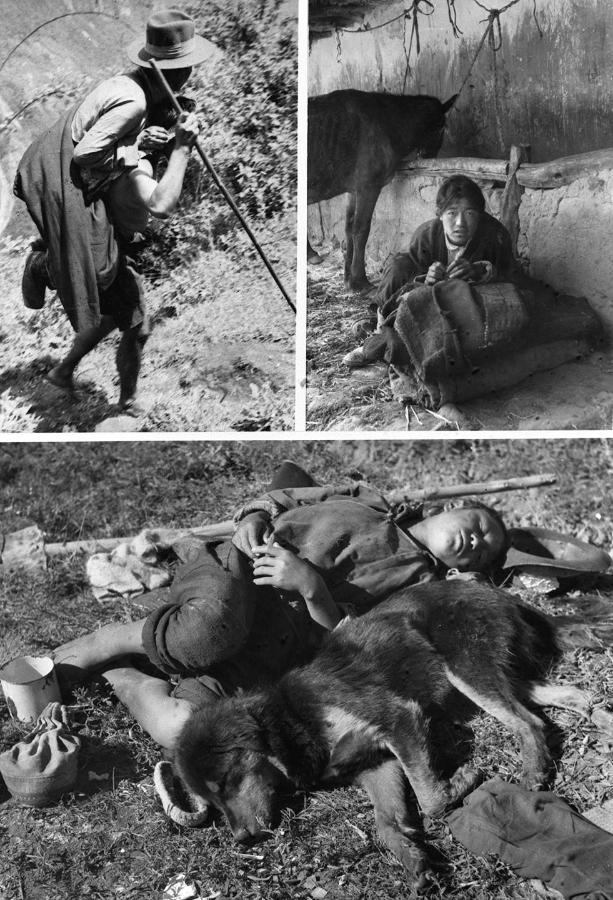上圖左:西藏農奴制度下的“人背人”(即農奴像牲畜一樣背馱著農奴主)差役。上圖右:和牲口同住的農奴。下圖:農奴益西欽沛服勞役后與犬同眠。(新華社發)