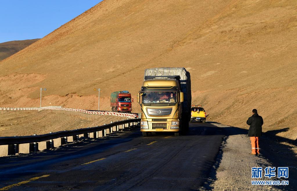 安多公路養護段巡護車和一輛貨車行進在國道109唐古拉山口路段(1月13日攝)。新華社記者 張汝鋒 攝