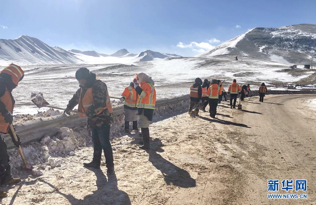 在國道109線K3351路段,安多公路養護段工作人員進行除雪除冰作業(2020年3月11日攝)。新華社發(后耀軍 攝)