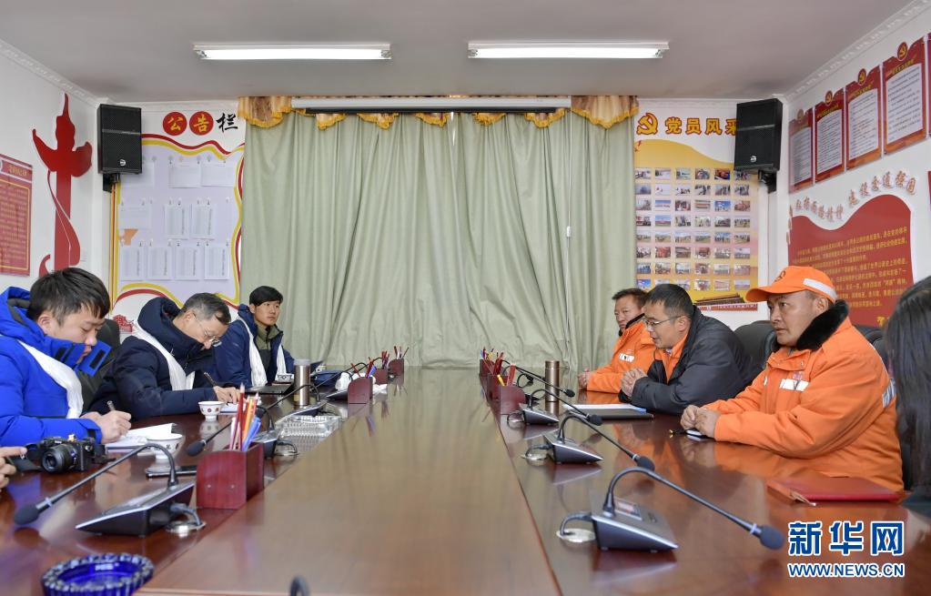 在安多公路養護段辦公室,扎西次仁(右一)和同事接受新華社記者采訪(1月13日攝)。新華社記者 張汝鋒 攝