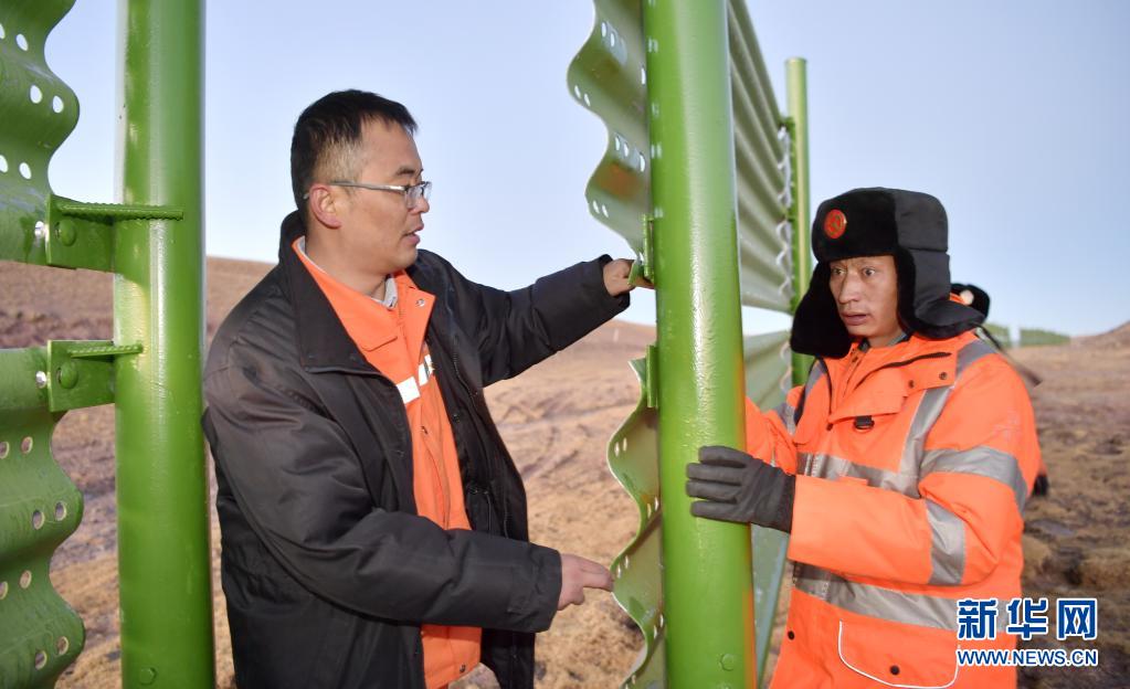 在國道109唐古拉山口處,安多公路養護段工作人員檢查山口的擋雪板(1月13日攝)。新華社記者 張汝鋒 攝