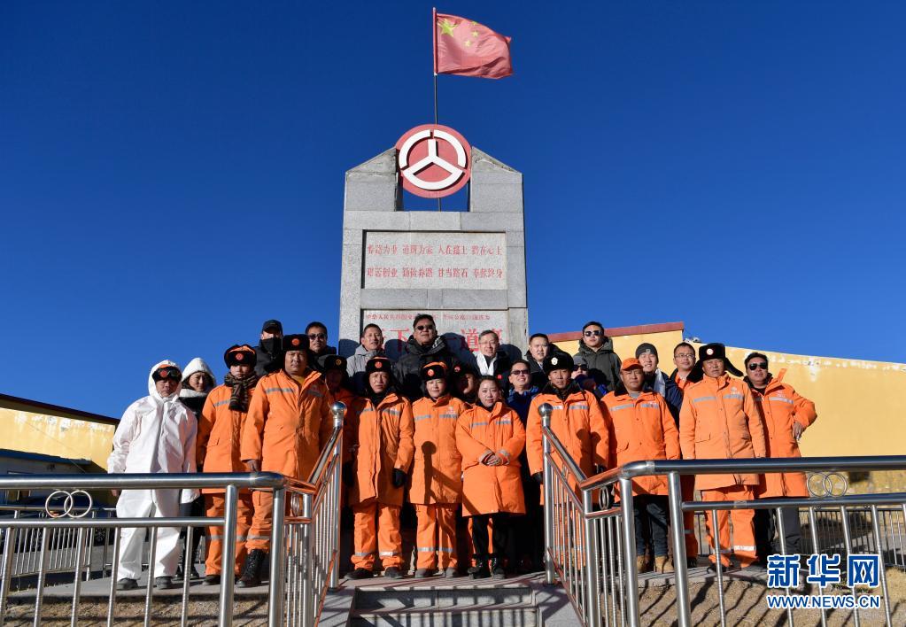 國道109線K3349路段應急便道施工隊的工作人員(前排)和來訪者合影(1月13日攝)。新華社記者 張汝鋒 攝