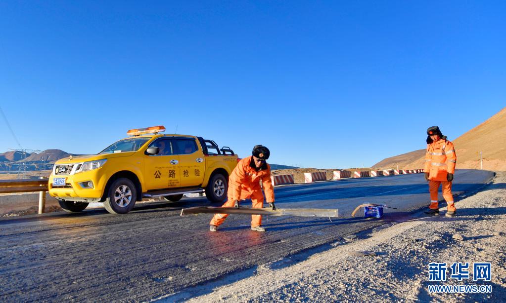 安多公路養護段工作人員在清理國道109上的垃圾(1月13日攝)。新華社記者 張汝鋒 攝