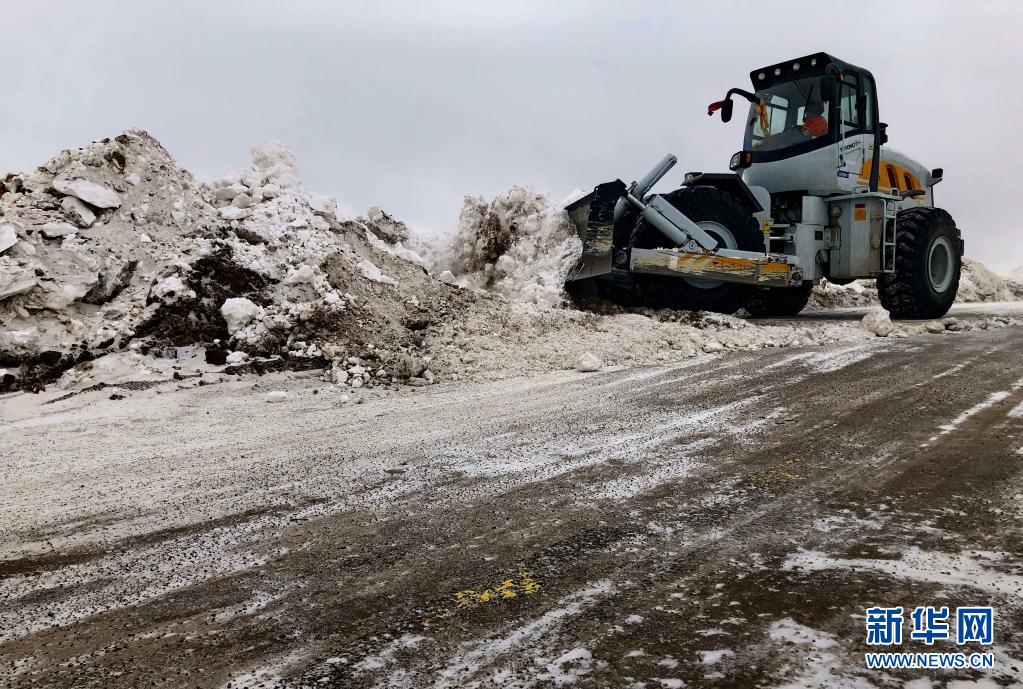 在國道109線K3378路段,安多公路養護段投入大型機械清除冰雪(2019年2月16日攝)。新華社發(邊巴央吉 攝)