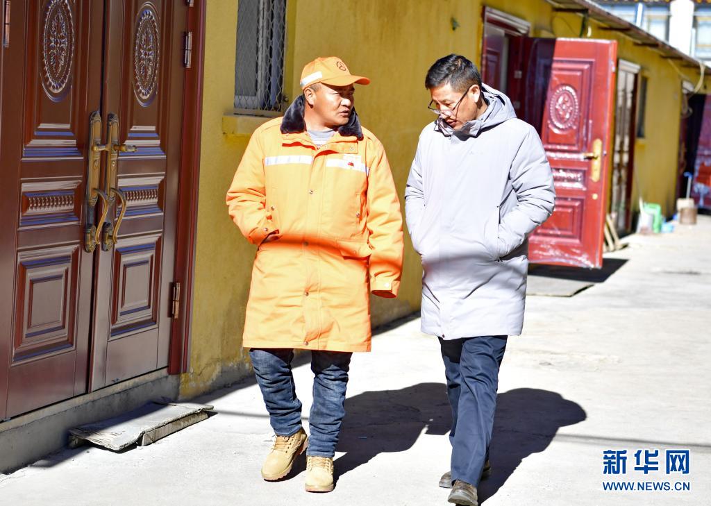在安多公路養護段家屬院,扎西次仁(左)和來訪的客人交流(1月13日攝)。新華社記者 張汝鋒 攝