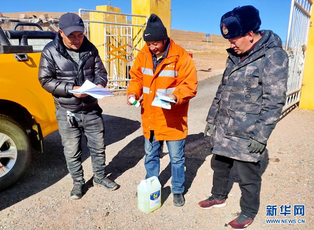 在安多公路養護段家屬院,扎西次仁(左)和同事準備為工區工作人員發放疫情防控物資(2月8日攝)。新華社發(斯塔卓瑪 攝)