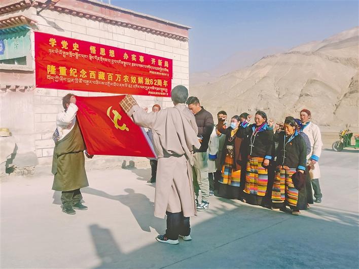 薩迦縣扎西崗鄉查務村農牧民黨員開展重溫入黨誓詞活動。