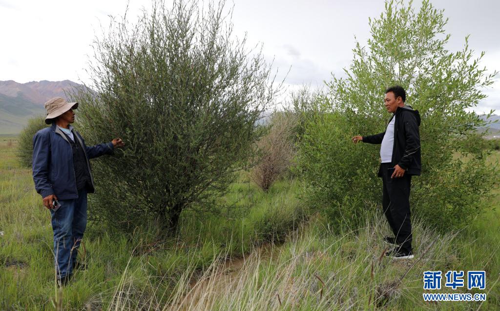 索朗羅布(右)在檢查樹(shù)的長(zhǎng)勢(shì)(2020年8月8日攝)。新華社記者 覺(jué)果 攝