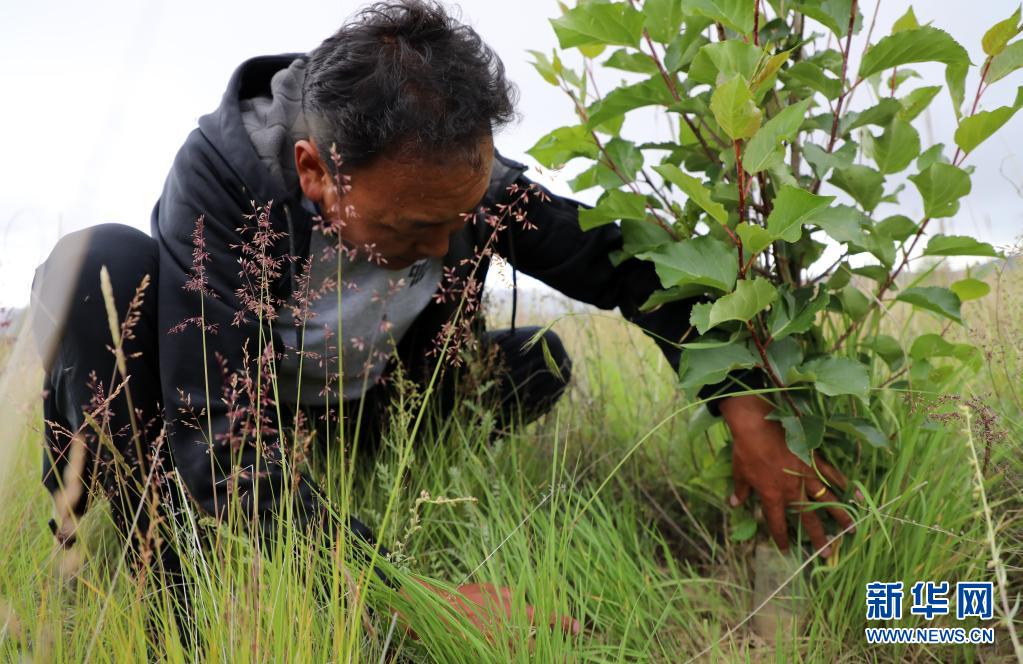 索朗羅布在檢查樹(shù)的長(zhǎng)勢(shì)(2020年8月8日攝)。新華社記者 覺(jué)果 攝