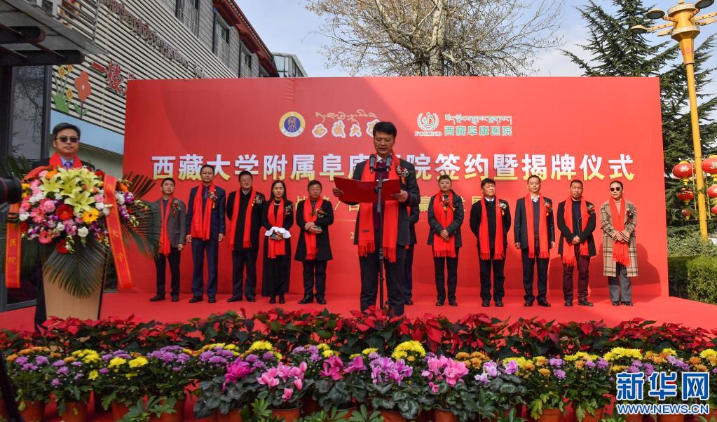 西藏大學附屬阜康醫院簽約暨揭牌儀式現場(4月7日攝)。