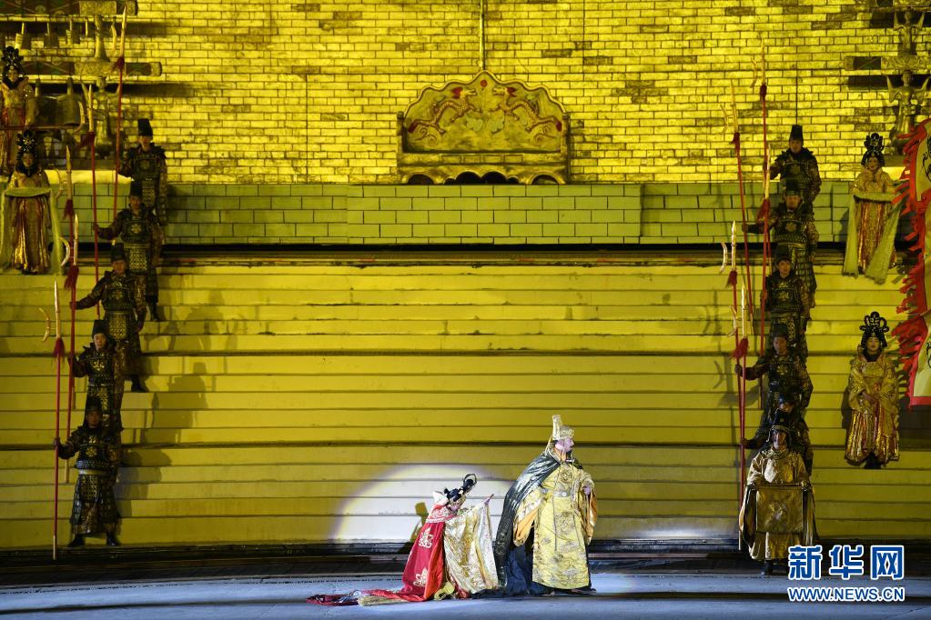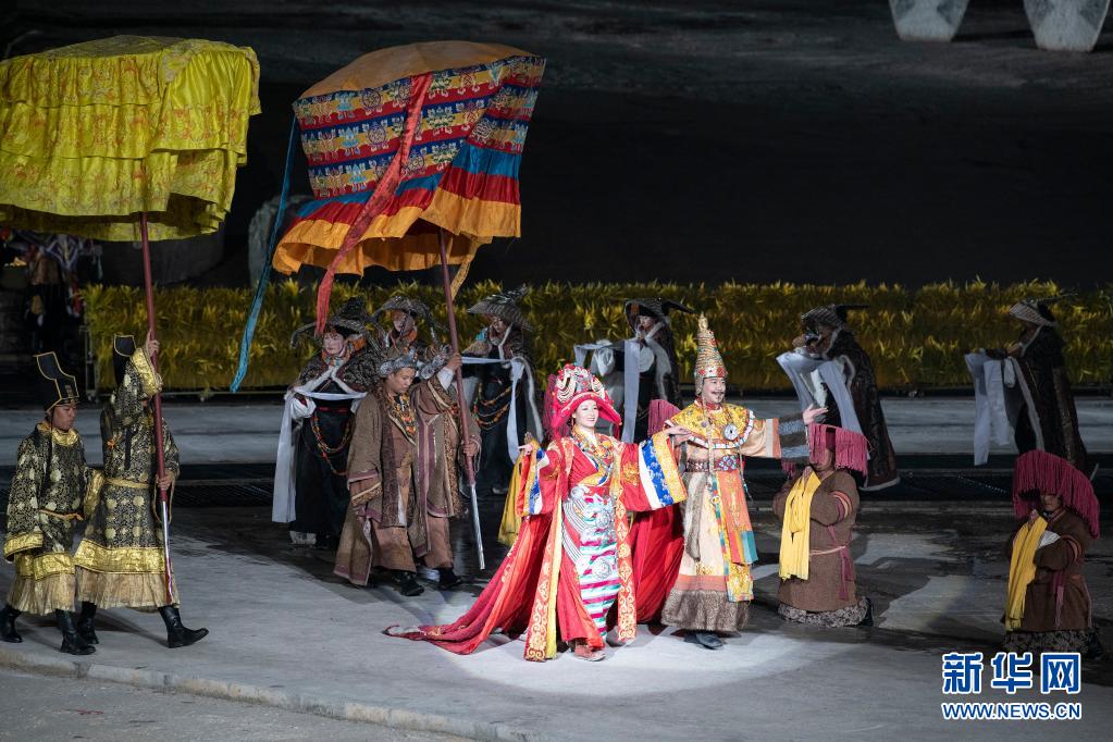 4月10日,演員在大型實(shí)景劇《文成公主》中演繹文成公主與松贊干布舉行婚禮的場景。新華社 孫瑞博 攝
