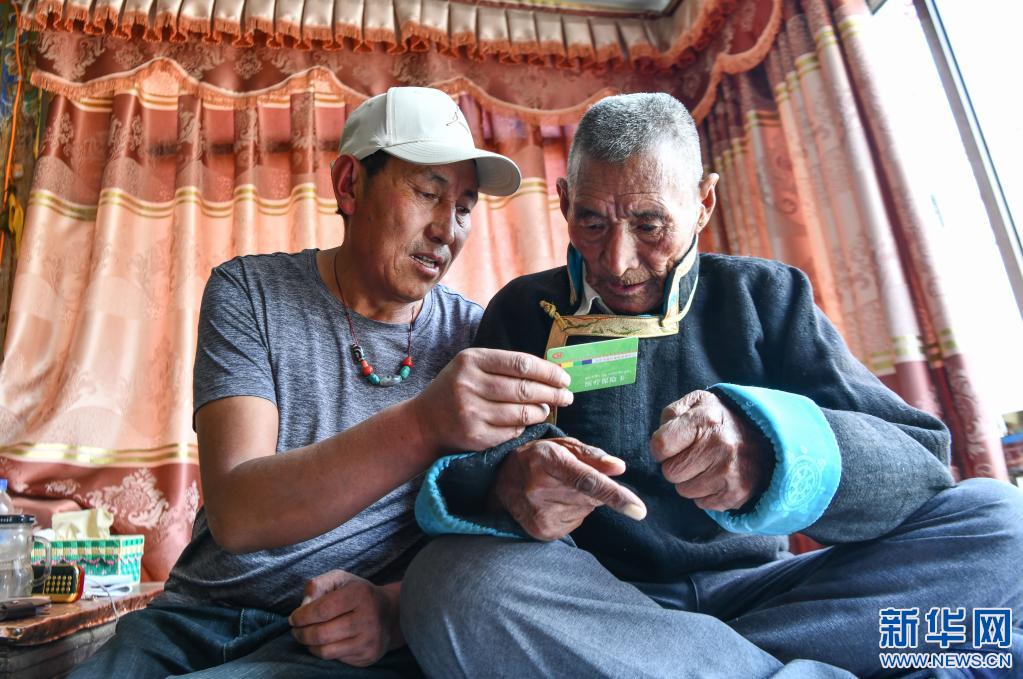拉布的兒子(左)在向老人介紹醫保卡的情況(4月25日攝)。新華社記者 晉美多吉 攝