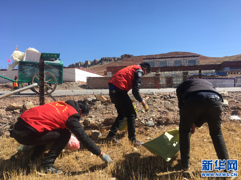 區黨校駐村工作隊組織在家牧民黨員在學校、廣場、村委會等場所集中清理生活垃圾和建筑垃圾(4月29日攝)。新華網發 王煦樟攝