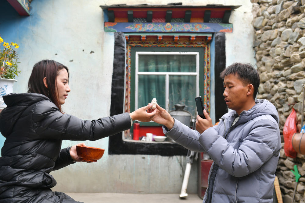 扎西拉姆(左)把剛揉好的糌粑遞給拍攝短視頻的丈夫田輝(4月2日攝)。新華社記者 孫瑞博 攝