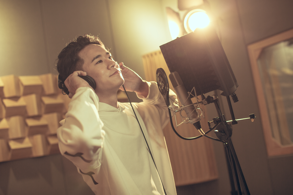 巴鄧頓珠在錄音棚錄制歌曲。新華社發 (受采訪者供圖)