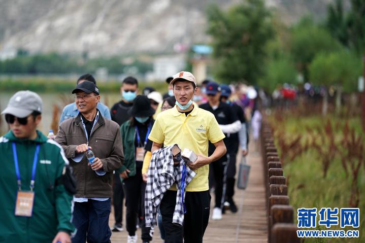 圖為在西藏拉薩市拉魯濕地的健身步道上,正在參加“2020年環拉魯濕地健步走系列活動”的選手們(2020年9月5日攝)。新華社記者 詹彥 攝