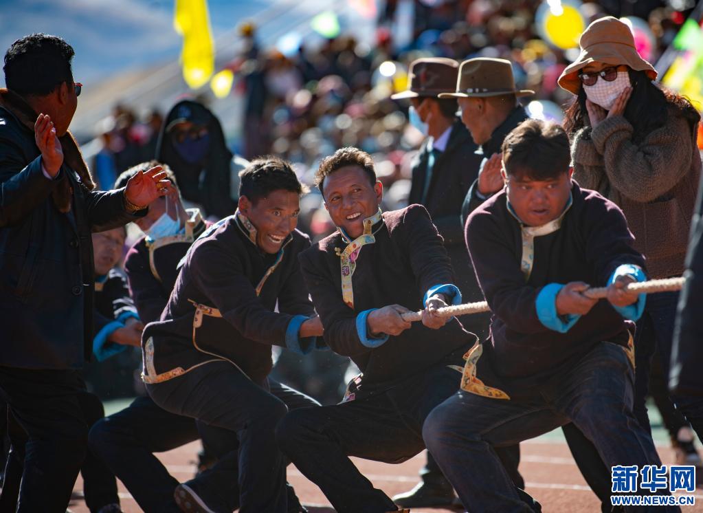 圖為2020年11月29日,山南市扎囊縣的農牧民在該縣首屆農民運動會中參加拔河比賽,在農閑期間參與全民健身的現場。新華社記者 普布扎西 攝