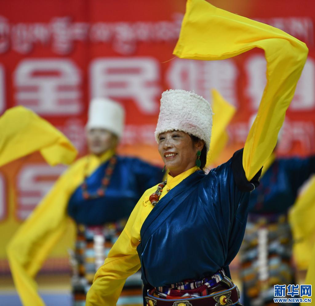 圖為2020年8月8日,2020年西藏自治區“全民健身日”活動啟動儀式在拉薩舉行的活動現場,“龍王潭羌塘鍋莊林”健身隊在啟動儀式上表演那曲鍋莊串燒。新華社記者 晉美多吉 攝