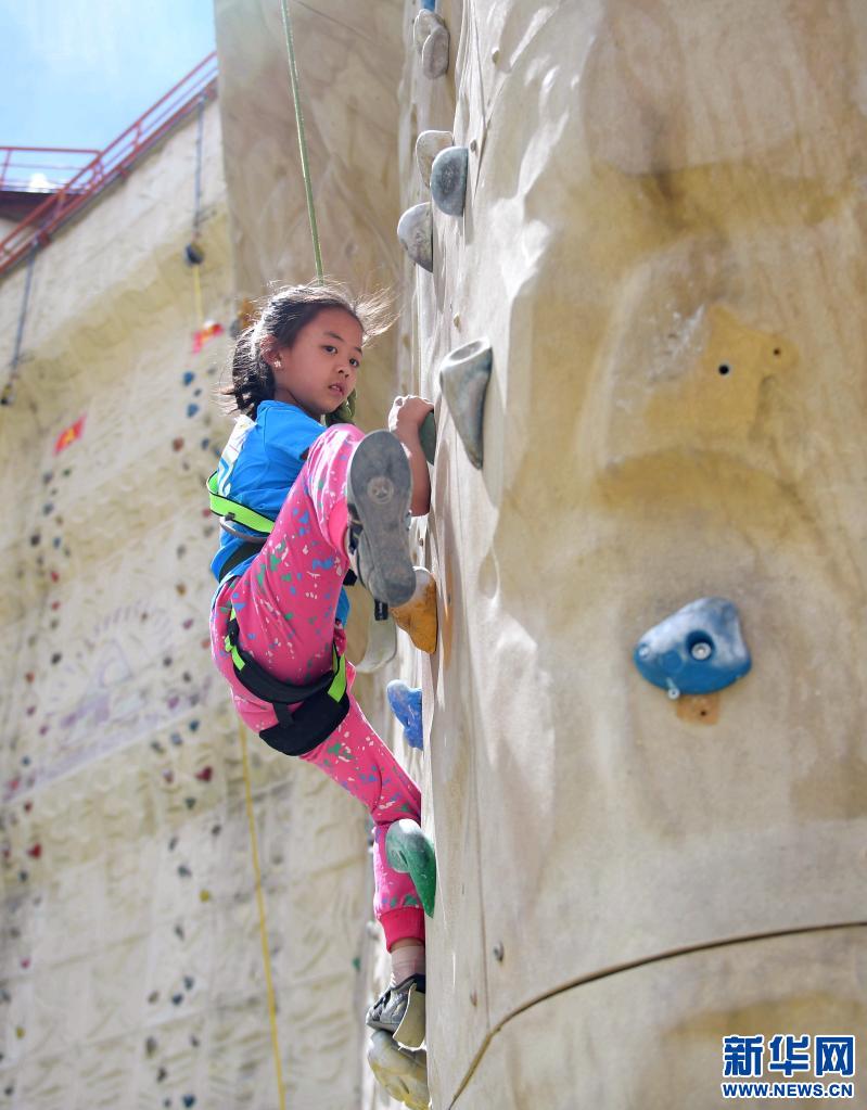 2017年5月,全運會群眾性項目西藏攀巖資格賽在拉薩舉行,圖為少年組小選手丹喬央宗在攀爬。新華社記者 晉美多吉 攝