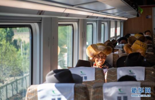 來自山南市貢嘎縣杰德秀鎮杰德秀村的巴珠,今年68歲,他一會兒從車窗眼望高山峽谷,一會兒摸摸車內現代化設施,這是他頭一次坐火車?!皬团d號和牛車比起來,像是在飛翔?!彼χf。
