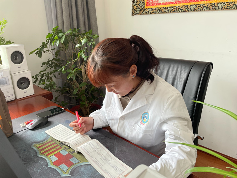 德吉正在翻閱《西藏天文氣象歷書》。
