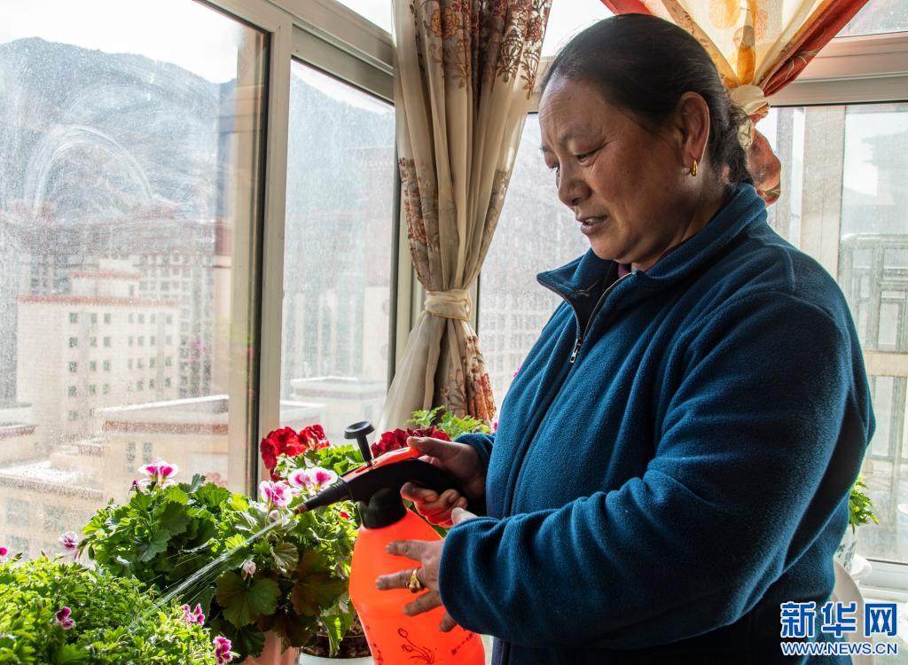 昌都市卡若區城關鎮居民永西在新家中給花草澆水(3月25日攝)。新華社記者 陳尚才 攝