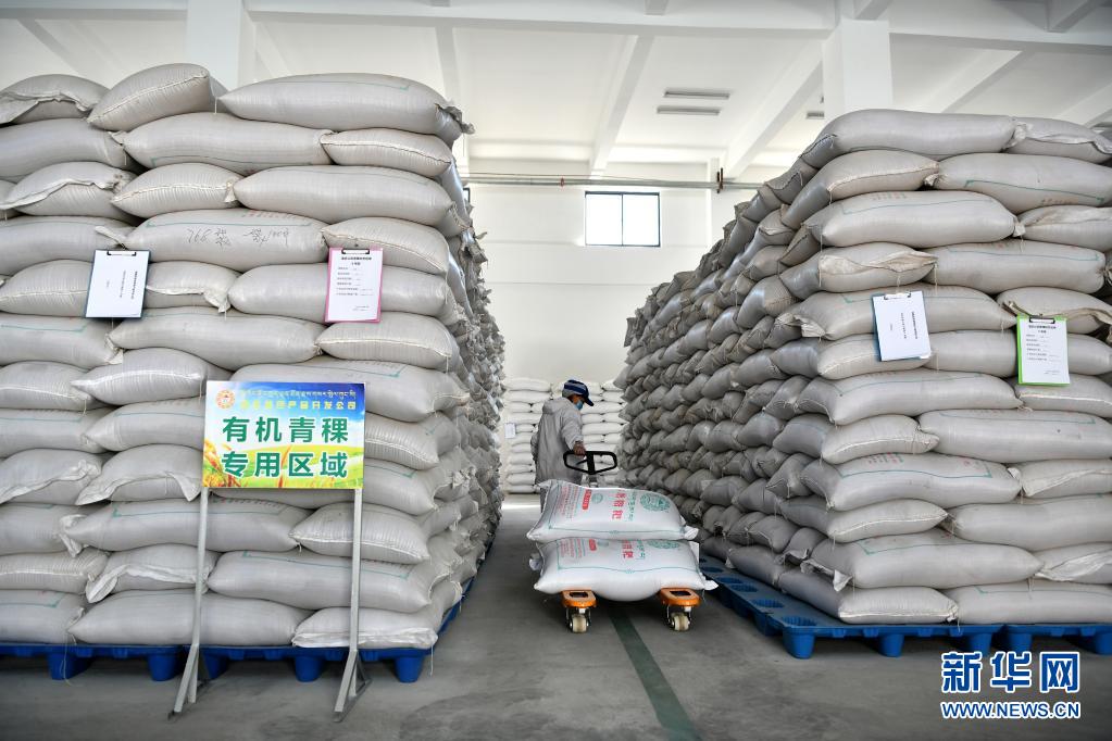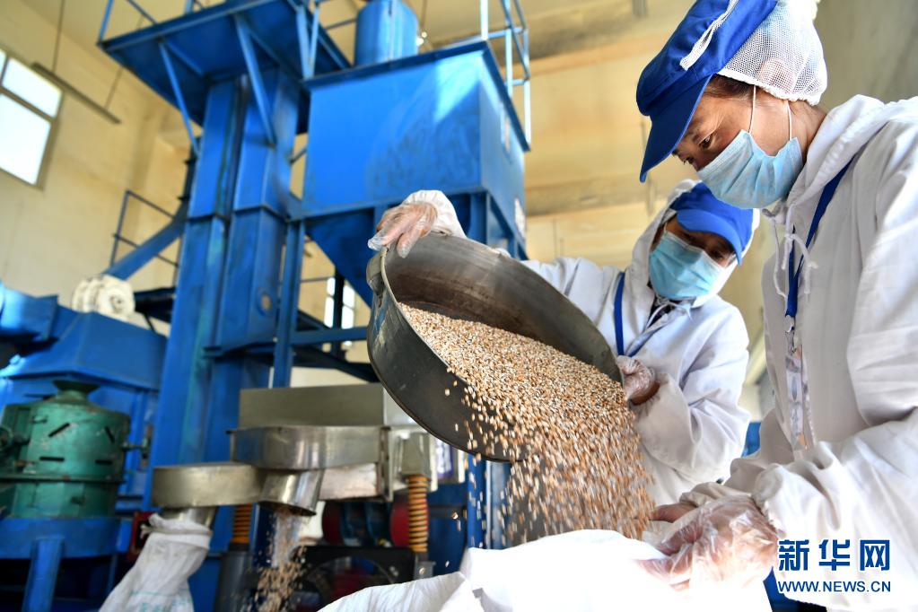 員工在洛宗特色產品開發公司的生產線上將烘炒好的青稞裝袋(7月24日攝)。新華社記者 李鑫 攝
