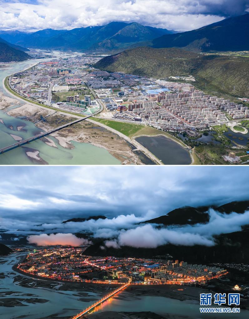 拼版照片:上圖7月19日拍攝的林芝市景色(無人機照片,新華社記者 普布扎西 攝);下圖為6月4日拍攝的林芝市夜景(無人機照片,新華社發(fā) 董志雄 攝)。