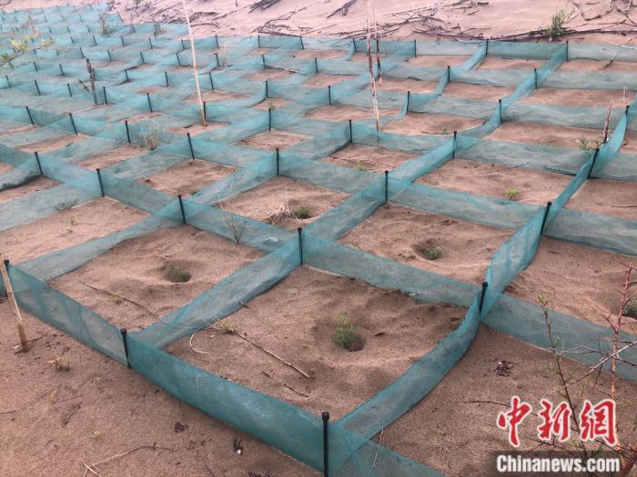 “傳統的方法是用廢樹枝等擺成方格等一定的形狀壓沙,里面再種上植物,效果很好但樹枝往往四五年就腐爛了;最近我們在嘗試推廣一種新型化學材料方格,成規(guī)模快,且能維持七到十年。”中國科學院西北生態(tài)資源研究院研究員常學向對記者說。