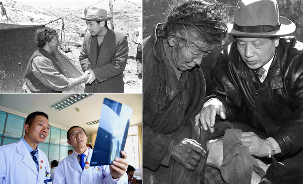 左上圖為來自陜西的援藏干部、阿里日土縣副縣長賈冗勇深入牧區,幫助藏族牧民解決生產、生活的實際困難(新華社記者土登攝,1997年11月11日發);左下圖為2017年8月3日,北京積水潭醫院援藏醫生龔曉峰(右)和北京天壇醫院援藏醫生李家謀在拉薩市人民醫院骨科病房內查看患者的X光片,進行工作交接(新華社記者晉美多吉攝);右圖為孔繁森(右)在阿里日土縣過巴鄉為孤寡老人益西卓瑪治病(新華社記者土登攝,1994年12月26日發)。