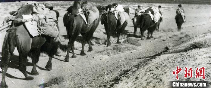 資料圖為1953年11月,西藏運輸總隊駝工往西藏徒步運輸物資。 中新社發 莫河駱駝場歷史陳列館 供圖