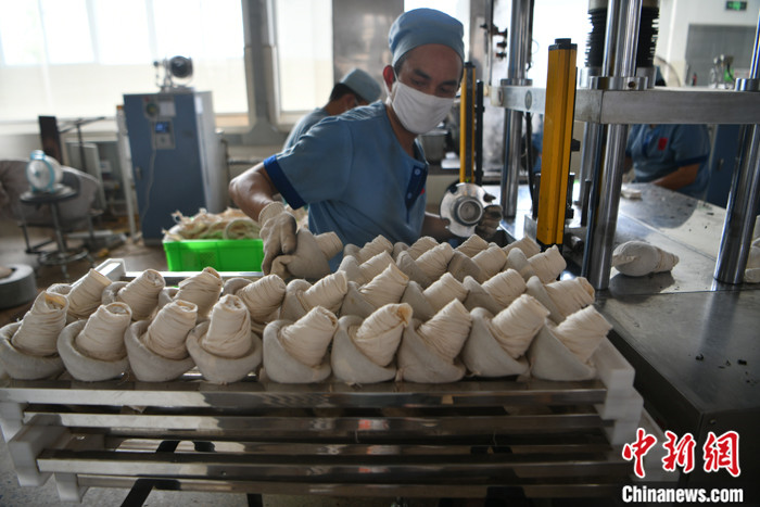 圖為8月12日,工人正在生產(chǎn)邊銷磚茶。中新社記者 劉冉陽(yáng) 攝