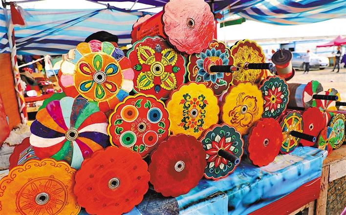 線軸也是藏式斗風箏時的重要武器。線軸,藏語稱為“擴羅”,是用幾根小圓木和兩個等圓的木板做成的,像個車輪,有軸心和軸桿,線就繞在輪軸上。線軸有大小之分,線軸越大,收放線的速度越快。參賽者根據自己的年齡大小、手掌大小、風箏大小以及風力大小等因素來選擇線軸,只有當線軸大小與實際情況相匹配,操作起來才得心應手。