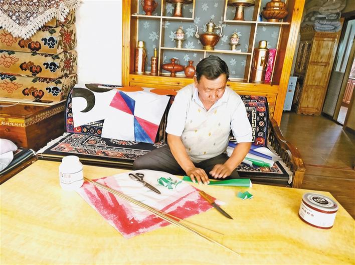 圖為拉薩風箏制作技藝自治區級代表性傳承人普窮在家制作風箏。