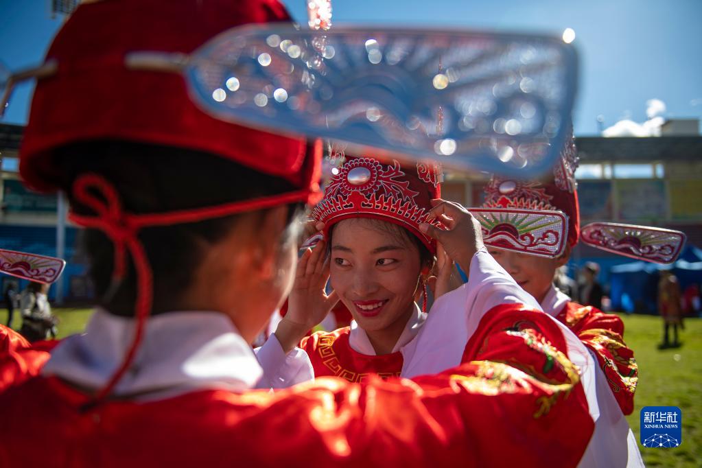 9月13日,參加2021雅礱文化旅游節開幕式文藝演出的山南市第二高級中學學生登臺前整理服裝。新華社記者 孫瑞博 攝