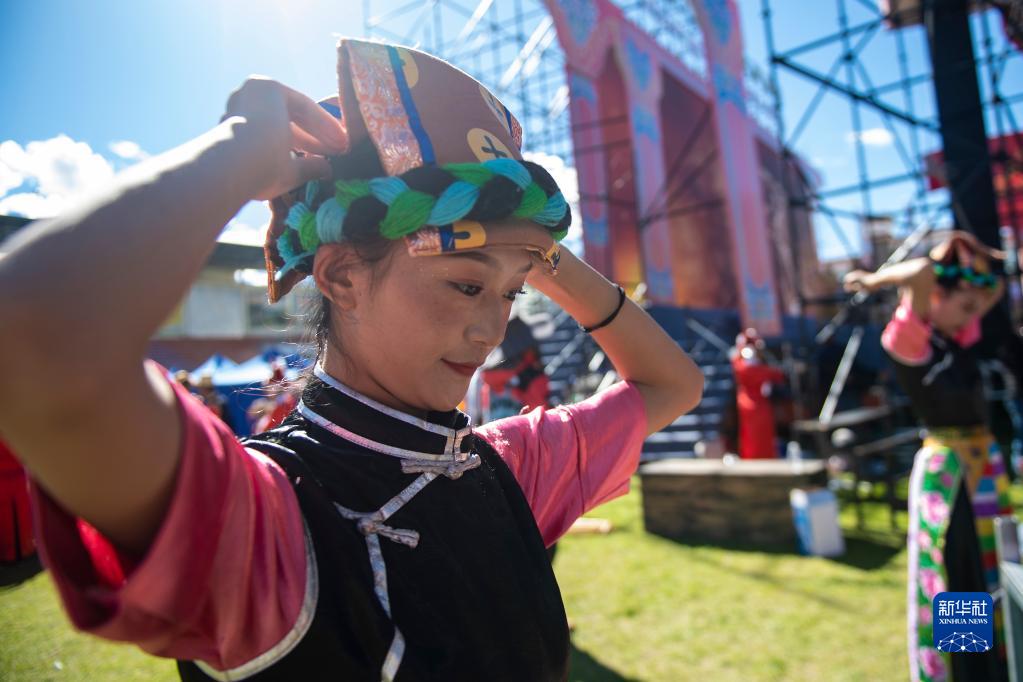 9月13日,參加2021雅礱文化旅游節開幕式文藝演出的演員在登臺表演前整理服裝。新華社記者 孫瑞博 攝