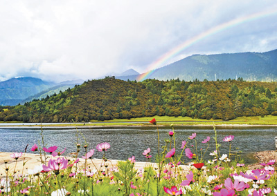 牧民騎馬穿行在花海中,遠處的高山在繚繞的云霧中若隱若現,炊煙裊裊,清風送來田間青稞的香氣。