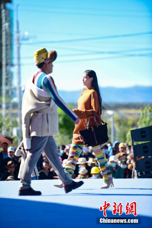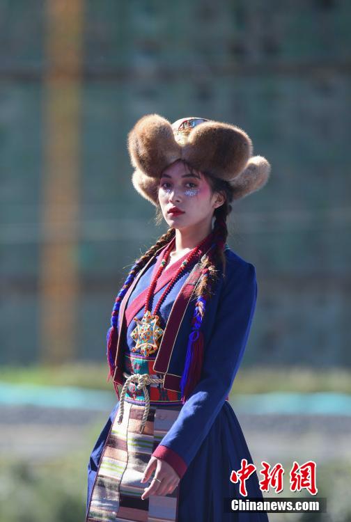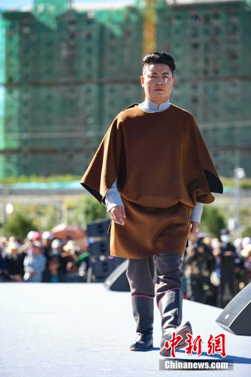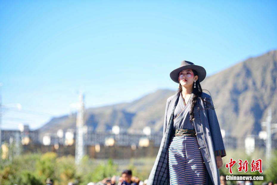 圖為當地藏族模特身著“雅魯藏布”現代藏裝服飾進行走秀。貢嘎來松 攝