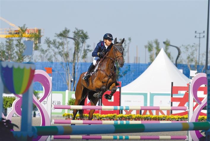 西藏自治區選手在進行馬術三項賽團體賽的最后一項比賽場地障礙賽。