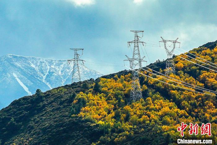 圖為雪山、秋色與藏中電力聯網工程的電塔。國網西藏電力有限公司 供圖