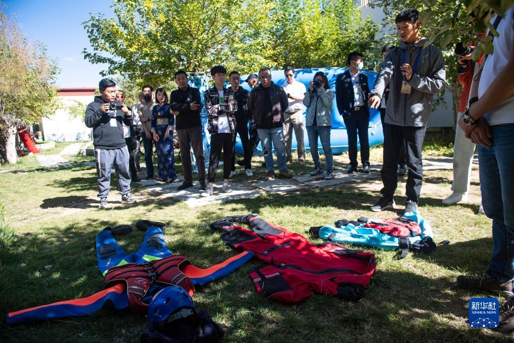 9月30日,一名工作人員在西藏旅游新業(yè)態(tài)分享會上介紹漂流項(xiàng)目中使用的救生裝備。新華社記者 孫瑞博 攝