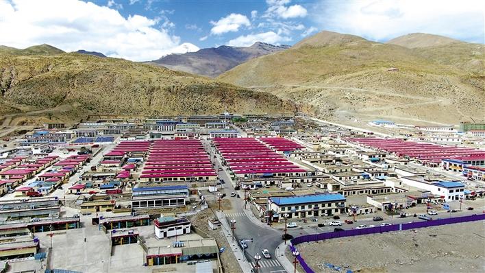 在這座現代化的小區里,一排排黃色的藏式民居整齊劃一,迎風招展的五星紅旗格外醒目,小區周邊學校、醫院、農貿市場等配套設施一應俱全。沐浴著和煦的陽光,孩子們在巷子里奔跑嬉鬧,老人們圍攏在一起拉家常。