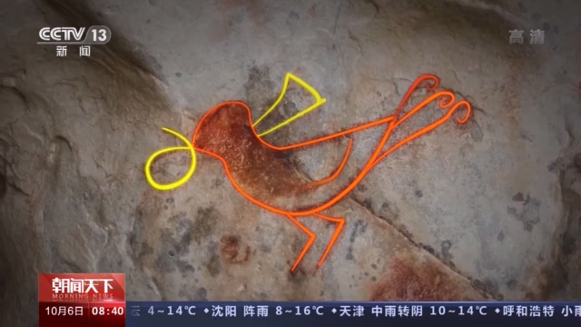 總臺記者 陳琴:現在我們就來到納木錯環湖科考巖畫調查點的1號點,您看到這個巖畫是由紅色的赭石這個顏料做成的,看起來特別像一只可愛的小鳥。