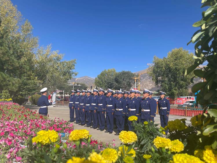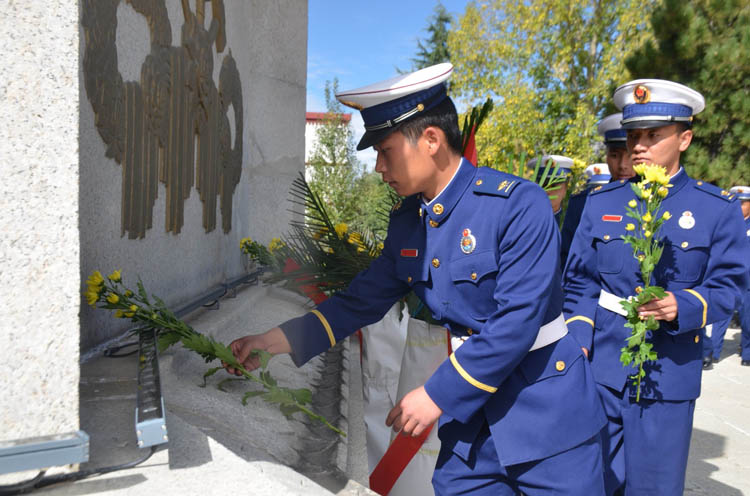 圖為西藏森林消防總隊特勤大隊在青藏川藏公路紀念碑前敬獻鮮花。